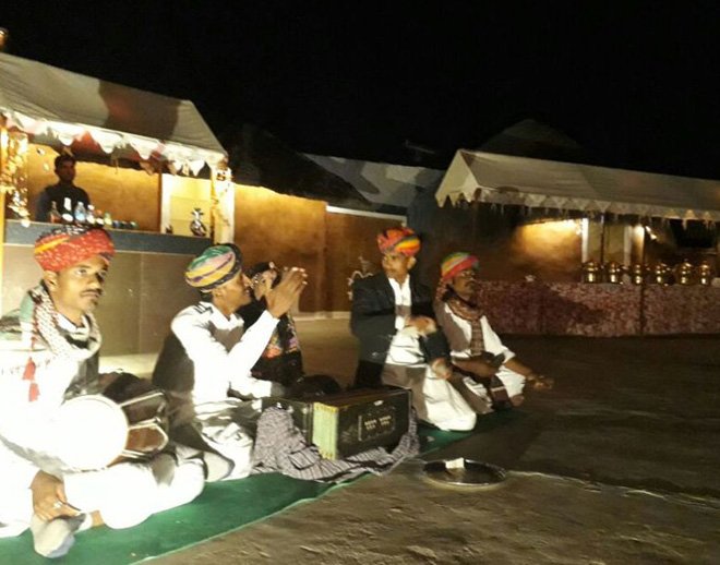 In the program, you will enjoy the Folk Dance and Music performance of Rajasthan, the most highlighted folk dance is Kalbelia Dance which is one of the most sensuous dance forms of Rajasthan. The entertainers are clad in the shining black color clothes which contains beautiful mirror work, men with colorful turbans playing their instruments and singing the music. Later enjoy the buffet dinner (pure veg.) arrangements in the camping area and take a pleasure in the golden sand dune of Jaisalmer and have a taste of the delicious dinner served in the majestic camp area.